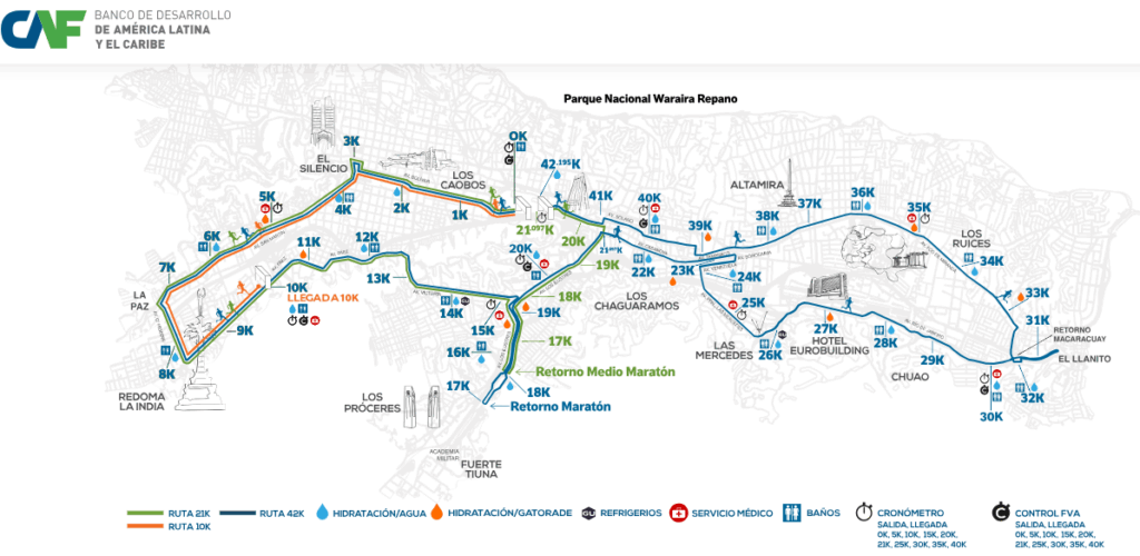Al igual que las ediciones anteriores, la salida será desde el Parque Los Caobos, con llegada en el mismo punto en las distancias de maratón y media. Los competidores de 10K finalizarán en la avenida Páez de El Paraíso y se ha establecido una logística de transporte para su regreso al Parque Los Caobos.